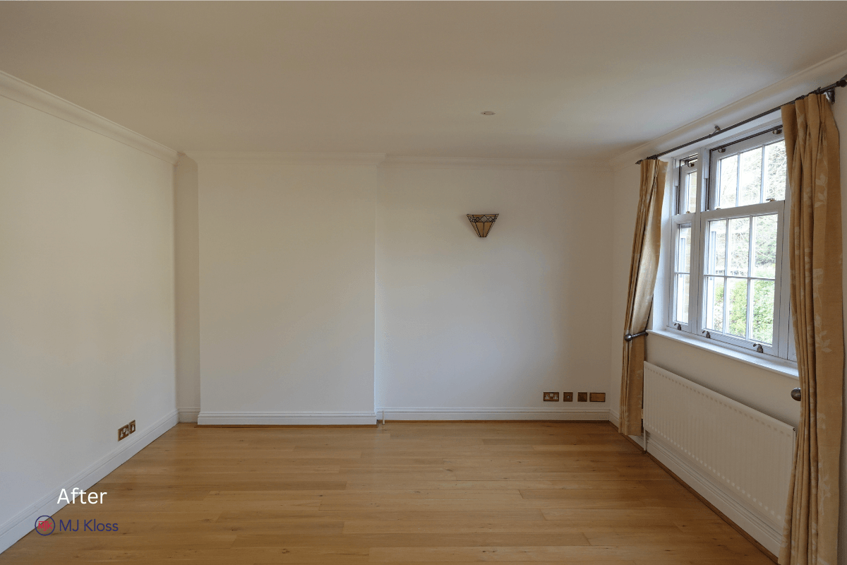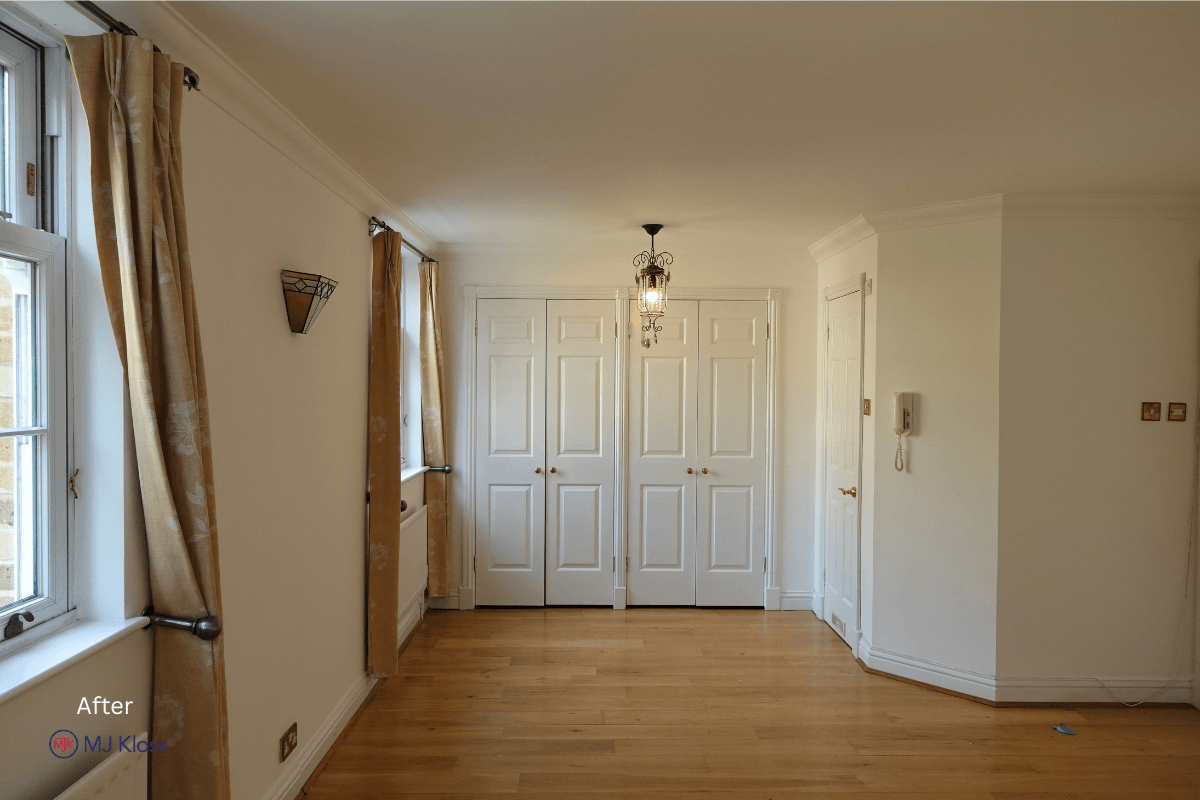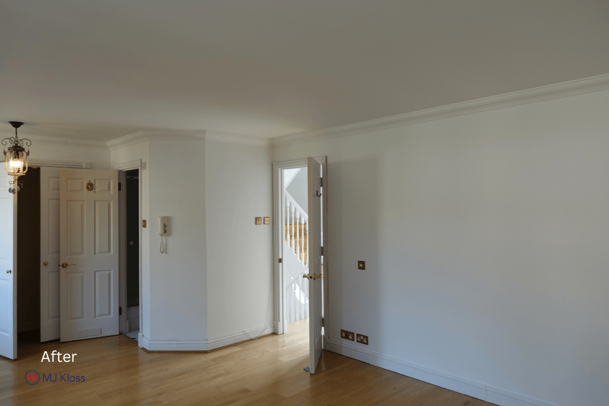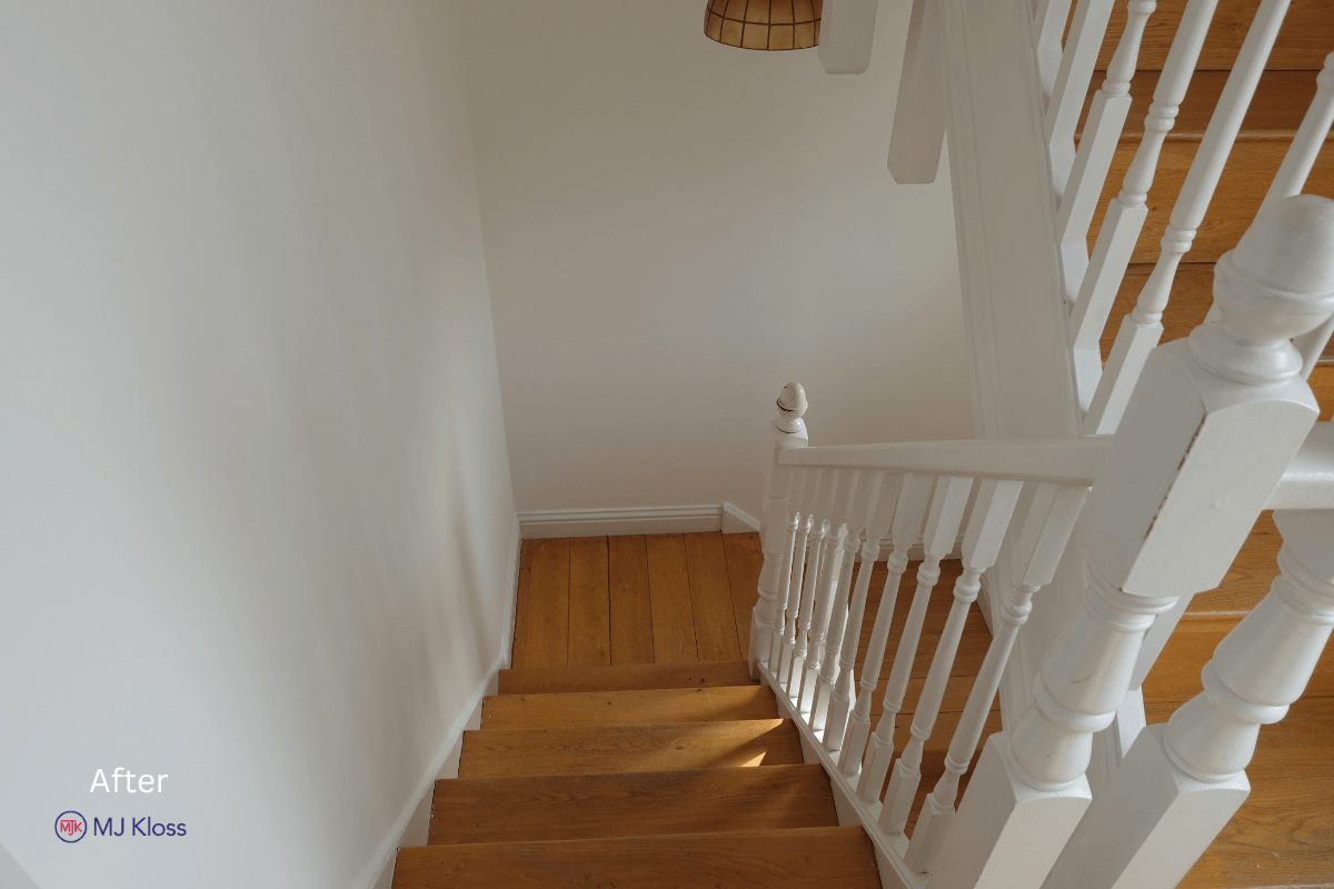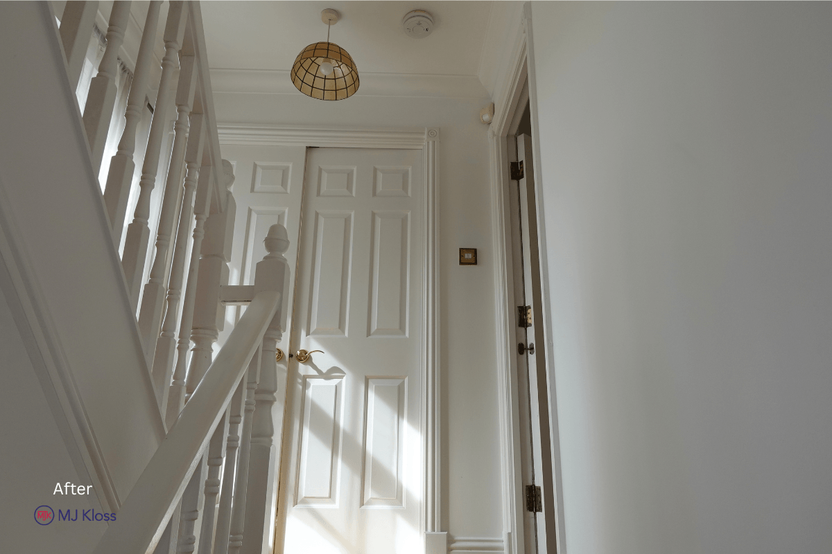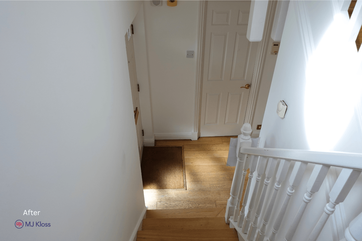 Walls and ceilings were finished in a consistent neutral tone to maximise light, while all woodwork, including doors, frames, and staircase elements, was completed to a uniform standard.